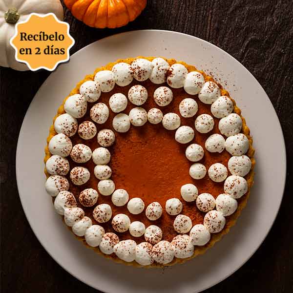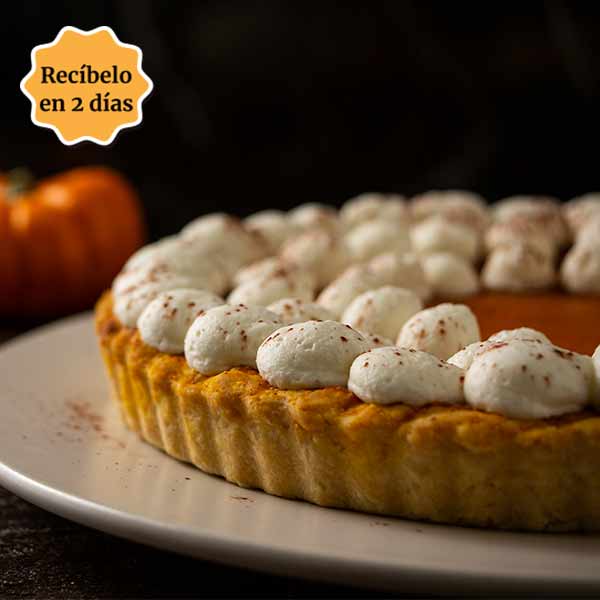 Nuestro pumpkin pie, está hecho con un puré de calabaza mantequilla, que es más dulce que la calabaza regular, y una masa para pie horneado. Lo finalizamos con tres hileras de crema batida, espolvoreada con un poco de canela para darle más sabor.